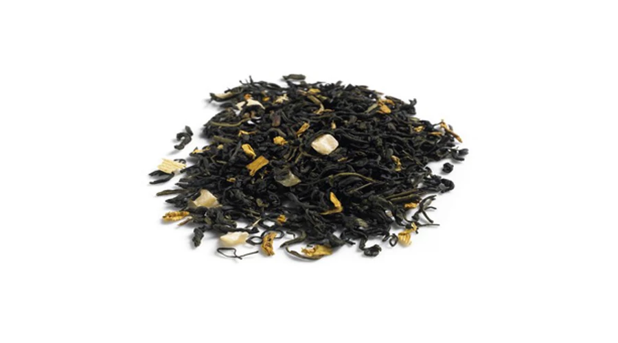 Fruity, tasty blend with Chun Mee from China, pine- apple pieces and sunflower blossoms, refined with fruity mango flavourings. Produces a pale cup with fresh and sweet mango flavour, which harmonises with the tart character of the green tea.